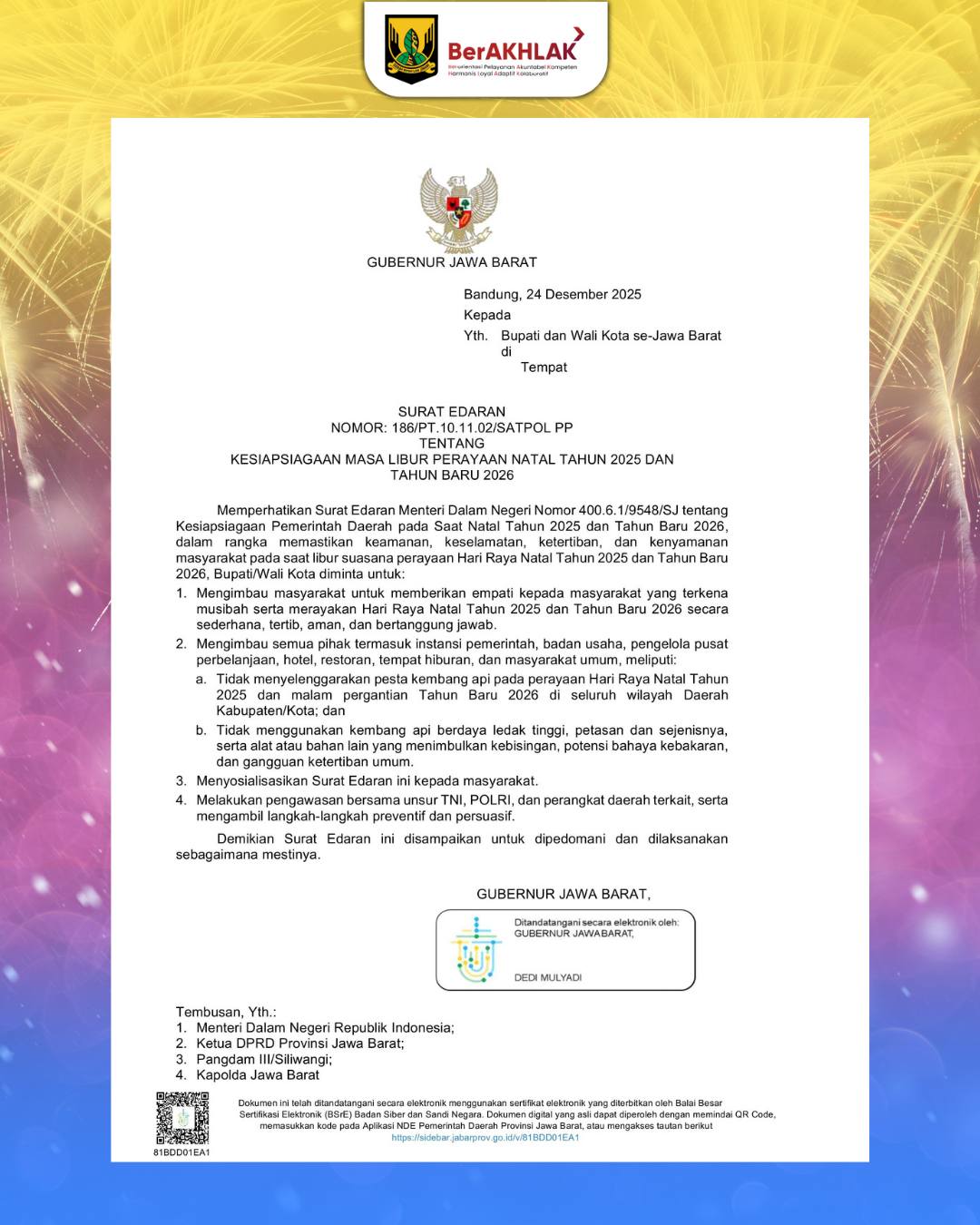 PanglawunganNews.com – Sukabumi – Sabtu, 27 Desember 2025 SUKABUMI – Menjelang pergantian tahun, Satpol PP Kabupaten Sukabumi menerbitkan Surat Edaran Nomor: 186/PT.10.11.02/Satpol PP sebagai panduan bagi masyarakat dalam merayakan libur Natal dan Tahun Baru. Inti dari edaran tersebut adalah seruan bagi seluruh warga untuk berperan aktif dalam menciptakan suasana lingkungan yang kondusif dan harmonis. Ada empat poin utama yang menjadi ajakan bersama dalam edaran tersebut: Satpol PP berpesan bahwa meski perayaan boleh berlangsung meriah, namun kepedulian sosial harus tetap menjadi prioritas utama. Dengan menjaga sikap saling menghargai, diharapkan perayaan akhir tahun di Kabupaten Sukabumi dapat berlangsung damai dan penuh berkah, sesuai semangat Sukabumi Mubarakah.