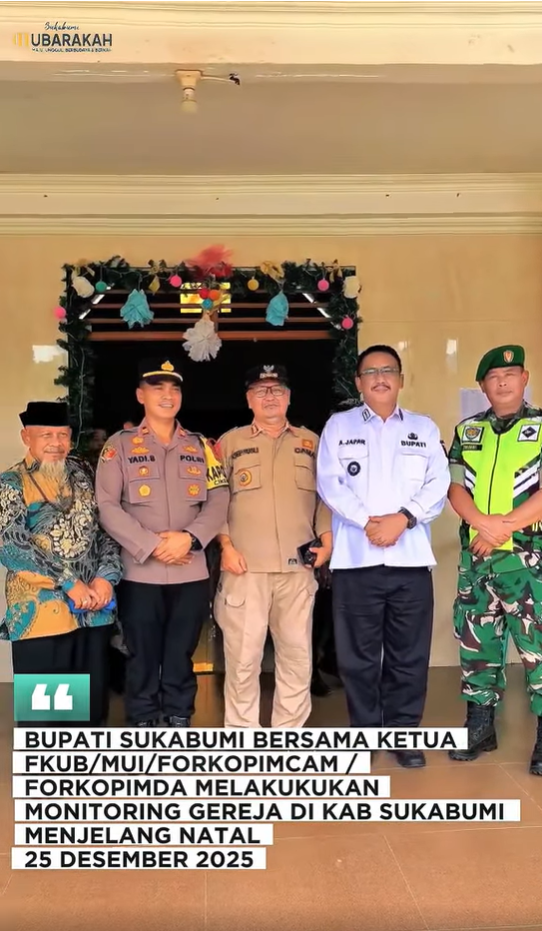 PanglawunganNews.com – Palabuhanratu, Sukabumi – Rabu, 24 Desember 2025 PALABUHANRATU – Memastikan situasi kondusif di wilayah hukum Kabupaten Sukabumi, Wakil Bupati H. Andreas bersama jajaran Forkopimda melakukan inspeksi mendadak ke sejumlah gereja, Rabu (24/12/2025). Kehadiran Kapolres Sukabumi AKBP Samian dan Dandim 0622 mempertegas kesiapan aparat dalam mengawal kelancaran ibadah Natal tahun ini. Kapolres Sukabumi AKBP Samian memastikan bahwa personel keamanan telah ditempatkan secara optimal di titik-titik strategis, khususnya di pusat keramaian dan lokasi ibadah di Palabuhanratu. Fokus utama kepolisian adalah memberikan jaminan ketenangan bagi umat yang melaksanakan ibadah tanpa rasa khawatir. “Kami pastikan pengamanan berjalan optimal sehingga umat dapat melaksanakan ibadah dengan tenang dan nyaman,” tegas Kapolres Sukabumi AKBP Samian. Senada dengan Kapolres, Ketua DPRD Kabupaten Sukabumi yang turut dalam rombongan juga memberikan dukungan atas kesiapan teknis di lapangan. Peninjauan ini merupakan bagian dari upaya kolektif pemerintah untuk memastikan bahwa seluruh rangkaian Natal 2025 di Kabupaten Sukabumi berjalan aman dan terkendali dalam semangat kebersamaan.