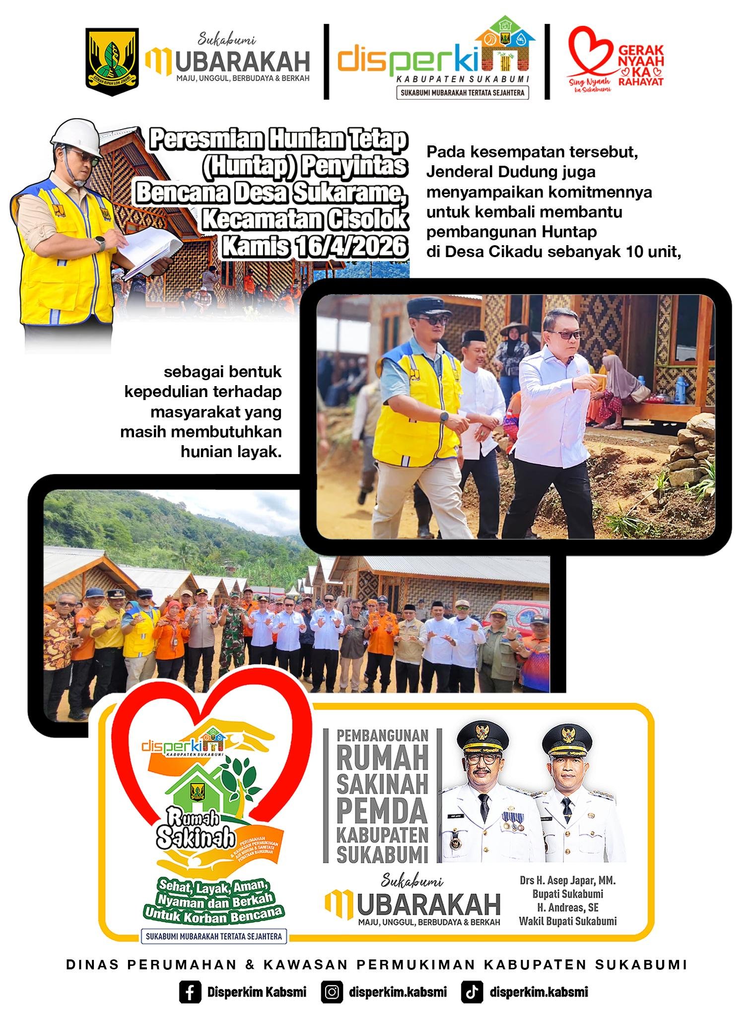 PANGLAWUNGANNEWS.COM, CISOLOK – Senyum bahagia terpancar dari wajah para penyintas longsor Desa Sukarame saat meresmikan hunian tetap (Huntap) baru mereka, Minggu (19/4/2026). Setelah melewati masa-masa sulit pasca-bencana akhir 2024, kini puluhan keluarga dapat memulai kehidupan di rumah yang lebih aman dan nyaman. Kehadiran Jenderal TNI (Purn.) Dudung Abdurachman di lokasi peresmian menambah suasana haru dan optimisme bagi warga yang sempat kehilangan segalanya akibat amukan tanah longsor setahun silam. Kepedulian Jenderal Dudung tidak berhenti di Desa Sukarame. Dalam kesempatan tersebut, beliau menyampaikan komitmen pribadinya untuk kembali membantu pembangunan Huntap di Desa Cikadu sebanyak 10 unit. Langkah ini merupakan bentuk kepedulian nyata terhadap masyarakat Kabupaten Sukabumi yang masih berjuang mendapatkan hunian layak pasca-bencana. Komitmen ini disambut hangat oleh pemerintah daerah dan masyarakat sebagai dorongan moral serta material yang sangat berarti bagi percepatan pemulihan sosial ekonomi warga. Bupati dan Wakil Bupati Sukabumi yang hadir dalam acara tersebut mengapresiasi tinggi atas dedikasi semua pihak, termasuk Disperkim dan para donatur yang telah bahu-membahu membangun kembali asa warga Cisolok. Dengan diresmikannya Huntap Sukarame, diharapkan para penyintas tidak lagi dihantui rasa waswas saat hujan turun dan dapat fokus menata kembali masa depan mereka. Semangat gotong royong ini menjadi landasan kuat bagi Kabupaten Sukabumi dalam membangun ketangguhan desa menghadapi tantangan alam di masa depan.