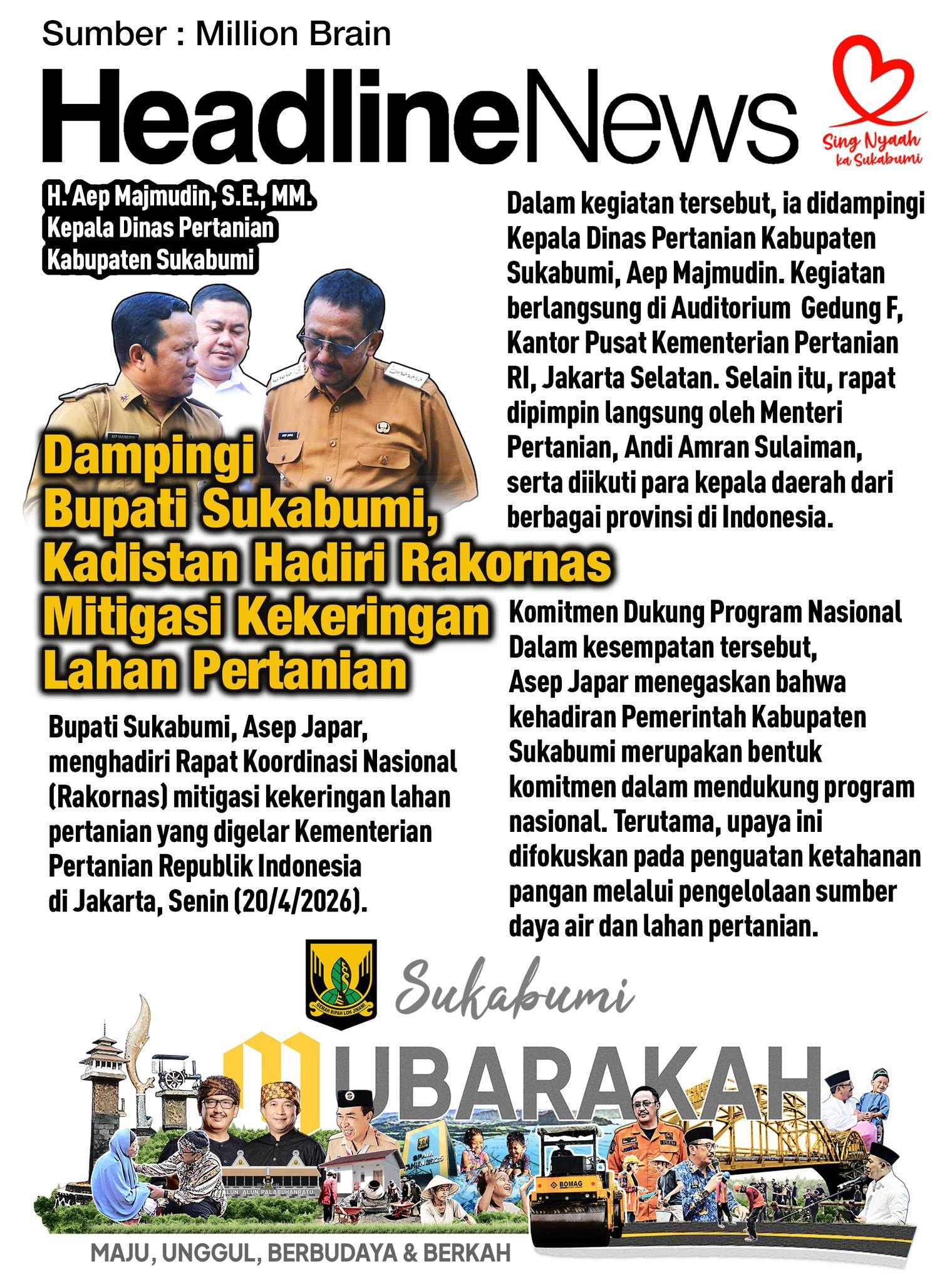 PANGLAWUNGANNEWS.COM, JAKARTA – Pemerintah Kabupaten Sukabumi bergerak cepat mengantisipasi prediksi BMKG terkait kekeringan ekstrem yang diperkirakan melanda pada tahun 2026. Bupati Sukabumi, Asep Japar, turun langsung mengikuti Rakornas Mitigasi Kekeringan di Kementerian Pertanian RI, Jakarta, Senin (20/4/2026). Langkah ini diambil untuk memastikan sektor pertanian di Kabupaten Sukabumi tetap mampu bertahan dan berkelanjutan meskipun dihadapkan pada kondisi kekurangan sumber air yang signifikan di masa mendatang. Bupati Asep Japar mendorong adanya efektivitas pengelolaan air di tingkat lokal sebagai benteng pertahanan pertama bagi para petani. Melalui sinergi dengan kementerian, daerah diminta menyiapkan usulan kegiatan yang menyasar langsung pada titik-titik rawan kekeringan, khususnya pada infrastruktur irigasi desa. “Kerja sama pusat dan daerah sangat penting untuk memastikan keberlanjutan sektor pertanian. Kita harus siap dengan langkah konkret agar dampak terhadap produksi pangan bisa ditekan sekecil mungkin,” ungkapnya. Selain memperkuat kesiapsiagaan, Rakornas ini menjadi momentum bagi Kabupaten Sukabumi untuk mengakselerasi program swasembada pangan berkelanjutan. Dukungan teknologi dan manajemen air yang modern menjadi sorotan utama dalam pertemuan tersebut. Dengan persiapan yang dilakukan sejak dini, diharapkan para petani di Sukabumi tidak perlu khawatir menghadapi musim kering yang panjang. Semangat gotong royong antara pemerintah dan masyarakat tani diyakini akan menjadi modal utama dalam menjaga stabilitas pangan dan kesejahteraan petani di seluruh wilayah Sukabumi.