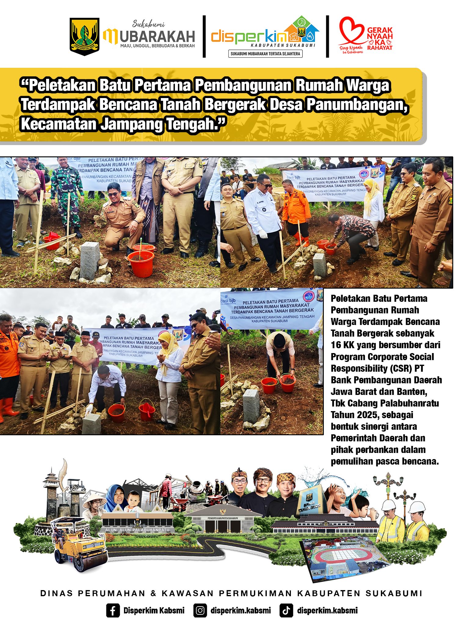 JAMPANGTENGAH – Bupati Sukabumi H. Asep Japar melakukan peletakan batu pertama pembangunan 16 unit Hunian Tetap (Huntap) di Kampung Pangantrongan, Desa Panumbangan, Senin (29/12/2025). Proyek yang didanai melalui CSR BJB Cabang Palabuhanratu ini berada di bawah pengawasan teknis Dinas Perumahan dan Kawasan Permukiman (DPKP/Perkim) Kabupaten Sukabumi untuk menjamin kelayakan hunian bagi warga terdampak bencana pergerakan tanah.