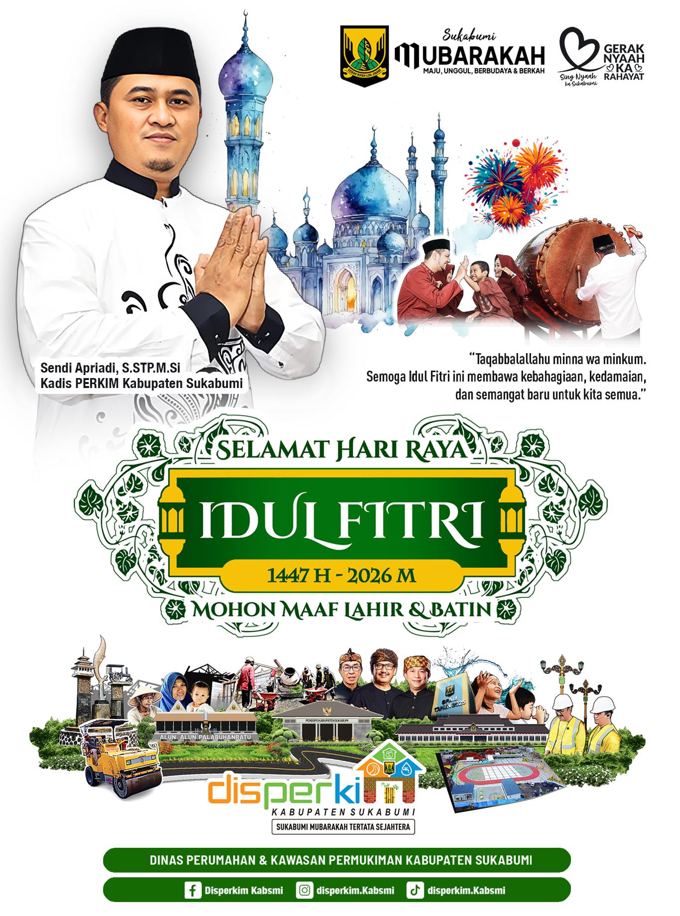 PANGLAWUNGAN.COM, PALABUHANRATU – Kepala Dinas beserta seluruh staf Disperkim Kabupaten Sukabumi mengucapkan Selamat Hari Raya Idul Fitri 1447 H kepada masyarakat terdampak bencana maupun warga umum. Momentum lebaran dijadikan penguat doa bagi pemulihan dan kesejahteraan warga.